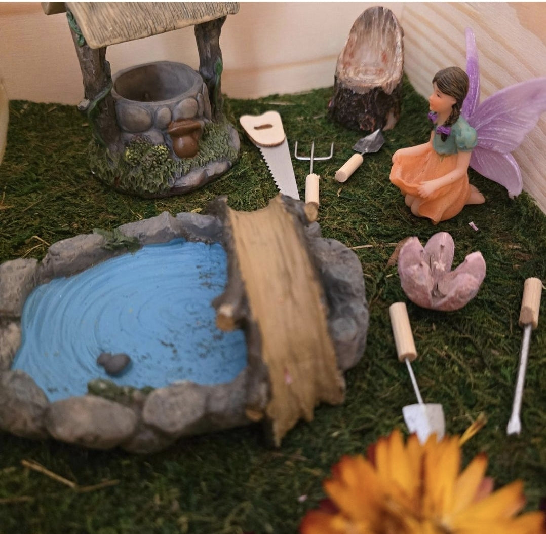 This Story Trunk scene depicts a hand-painted and crafted fairy garden complete with a fairy figurine, a well, pond and flower embellishments.