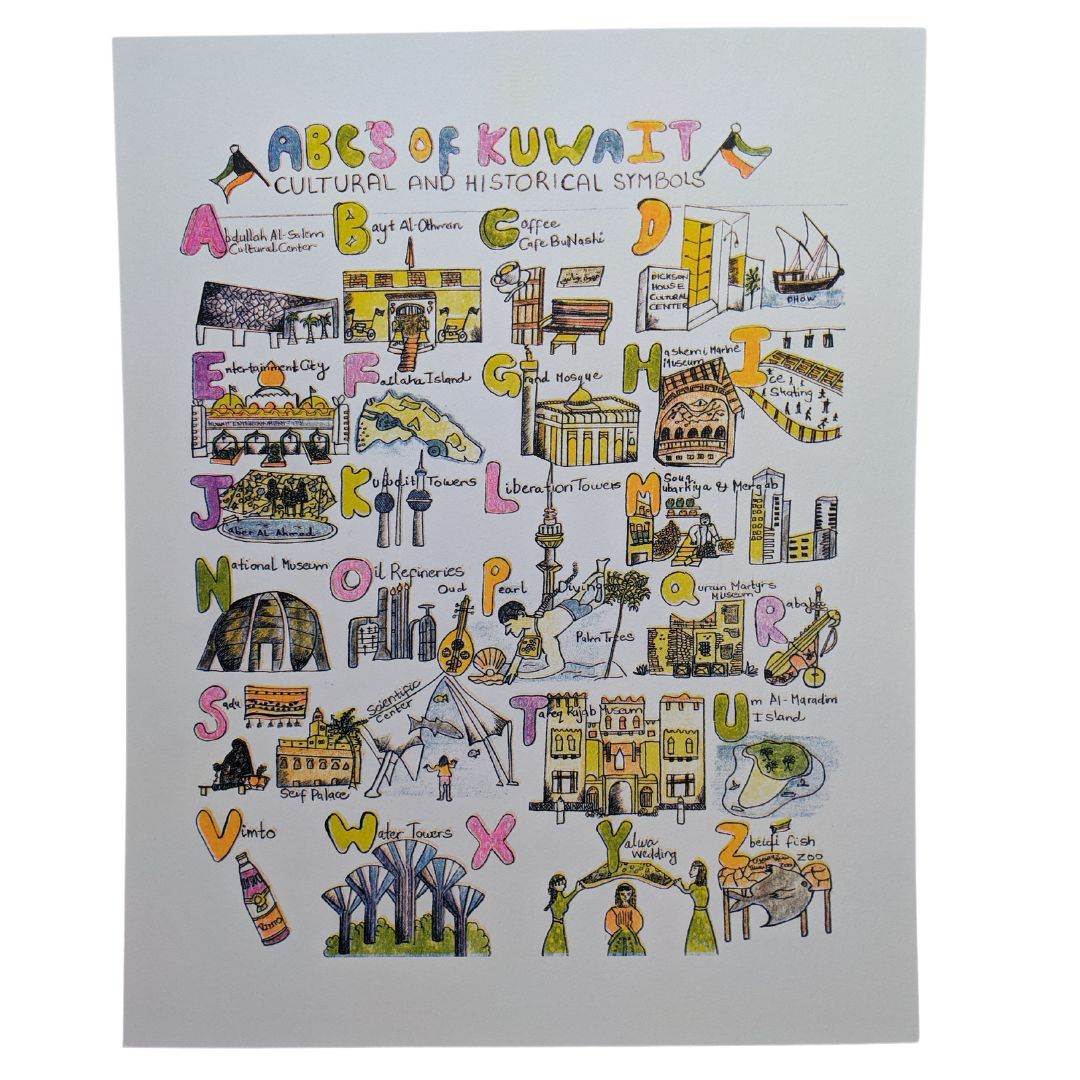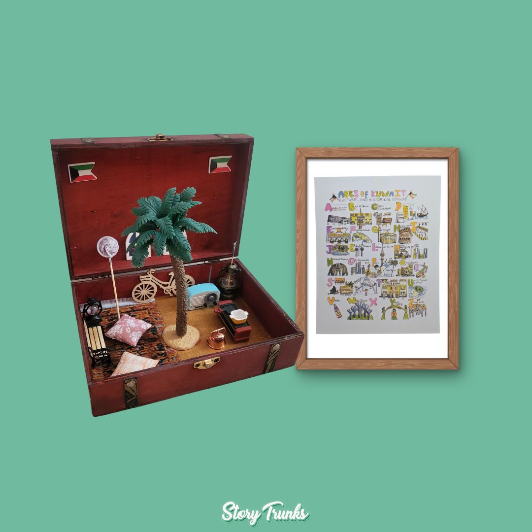 A Story Trunk depicting a cozy old courtyard of a Kuwaiti home, paired with an ABC's of Kuwait hand-sketched poster print for kids.